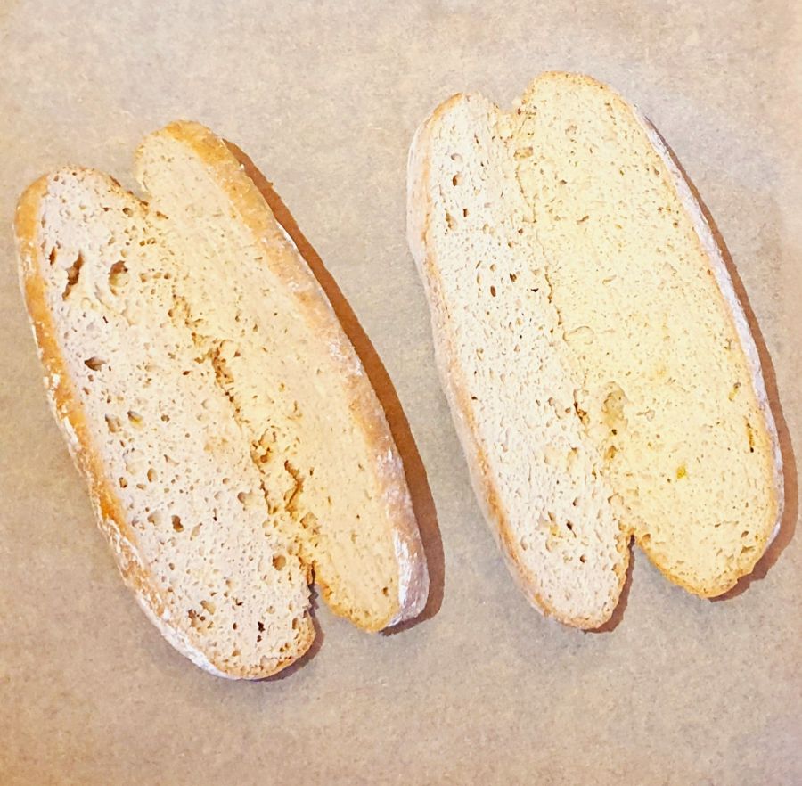 2 gleich große Baguette formen. Mit Bambusfaser bestauben und bei 160 Grad Umluft für 50 Minuten backen. Nach dem Backen auf einem Gitter auskühlen lassen.