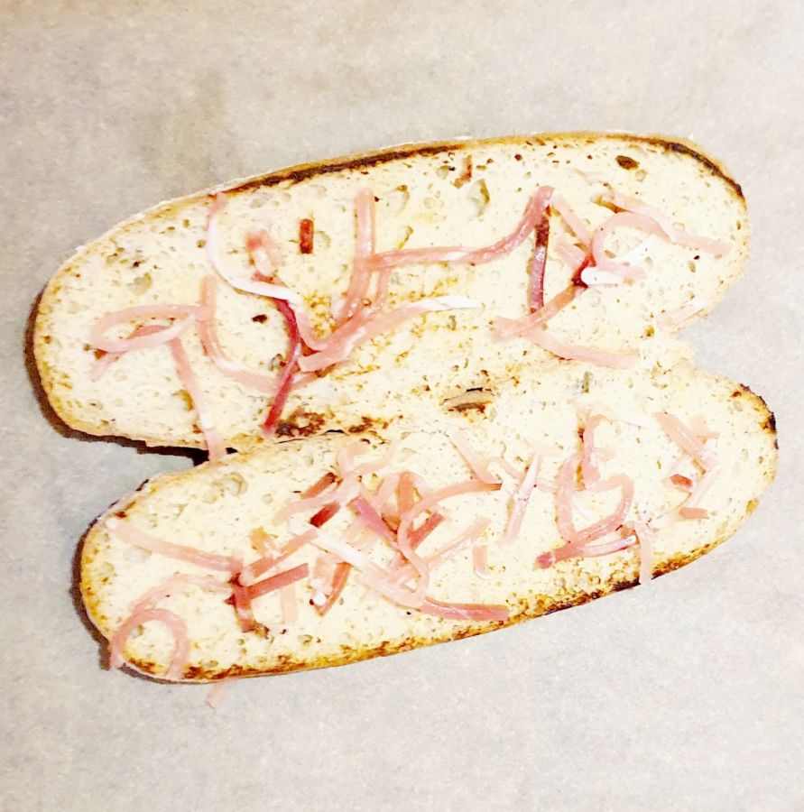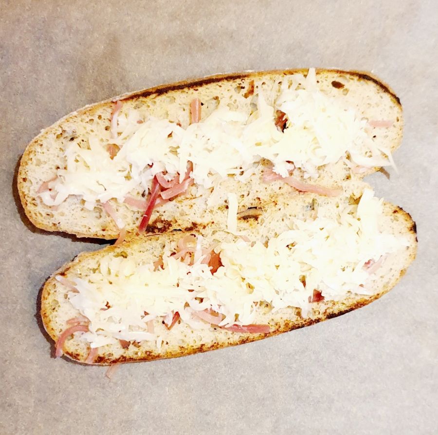 In einer beschichteten Pfanne die Baguettes mit der Innenseite in die Pfanne legen und kurz anrösten. Etwas abkühlen lassen.