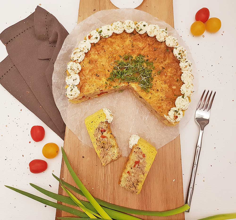 Habe die fertige Quiche mit 60g Frischkäse dekoriert und mit Bruschetta & Tomate + etwas Petersilie bestreut. (Nährwerte sind OHNE Deko)
