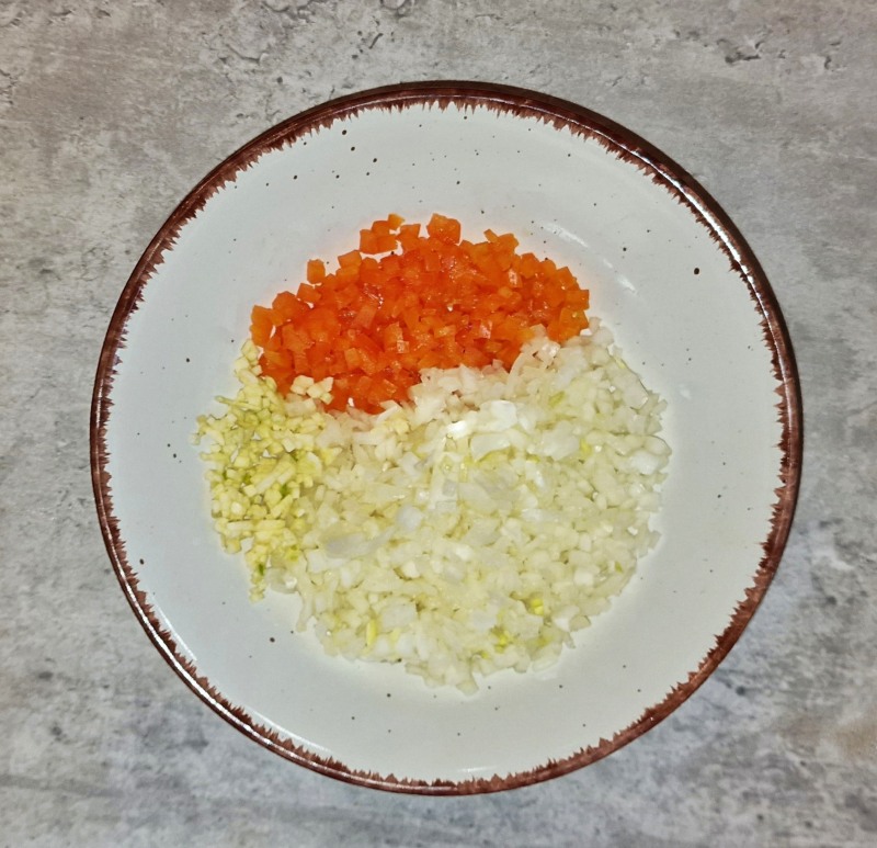 Zwiebel, Knoblauch und Paprika sehr fein schneiden, in einer Pfanne die Butter schmelzen, und die Zwiebelmischung leicht anbraten. Dann zur Seite stellen und abkühlen lassen.
