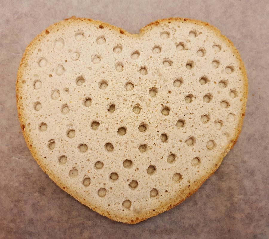 • Den Boden nach dem Auskühlen in der Mitte durchschneiden und mit dem Stiel eines Löffels in die Böden kleine Löcher machen.