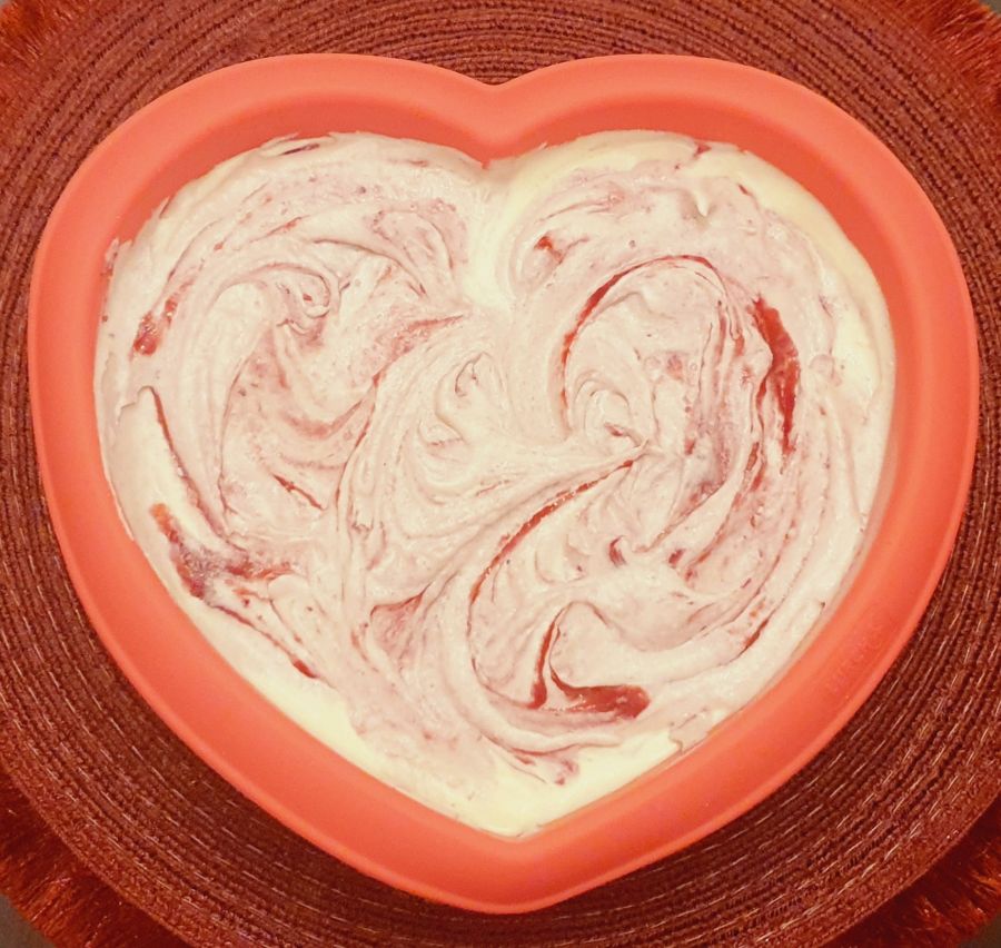 • 2/3 der Creme auf den Boden füllen. Da abwechselnd mit einem Löffel einmal die Masse ohne Beerencreme, einmal mit Beerencreme abwechselnd einfüllen. Mit einer Gabel die Beerencreme einswirrln.