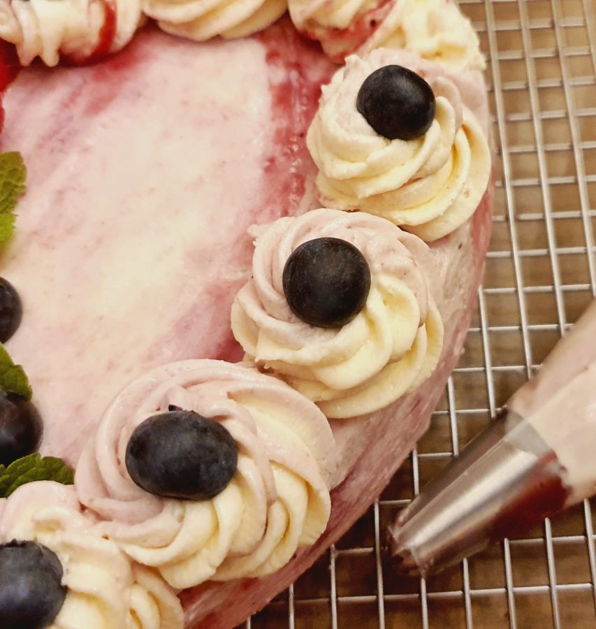 • Ich hab die Creme in 2 Teile geteilt und in einen Teil Beerencreme untergerührt. Bei der Beerencreme selbst entscheiden wie viel man mag. Ich hatte je Boden 15g und 50g unter die Creme geführt. 10g zum swirrlen der Creme und 10g fürs bestreichen aufgehoben.