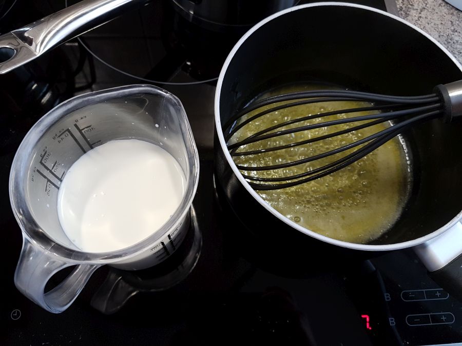 Die Butter soll am Topfboden eine leichte Bräune zeigen, aber nicht schwarz werden. Sobald ihr erste braune Schlieren erkennen könnt, SOFORT mit der Wasser-Sahne-Mischung ablöschen und vom Herd nehmen.