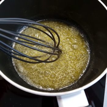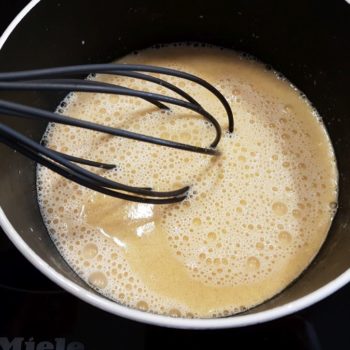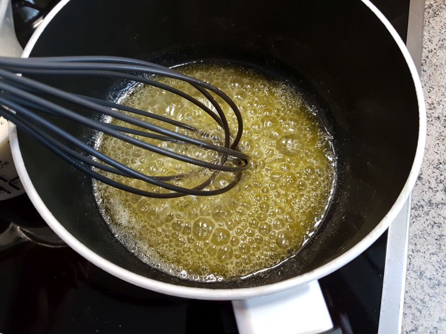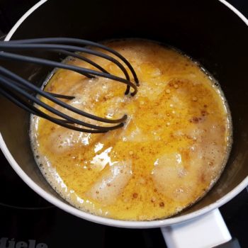 Die Butter in einem Topf schmelzen und unter ständigem Rühren bei mittlerer Hitze brutzeln lassen. Am Anfang schäumt es noch etwas stärker, da die in dem Butter enthaltene Feuchtigkeit verdampft. Sobald das Schäumen nachlässt, ist Vorsicht angesagt!