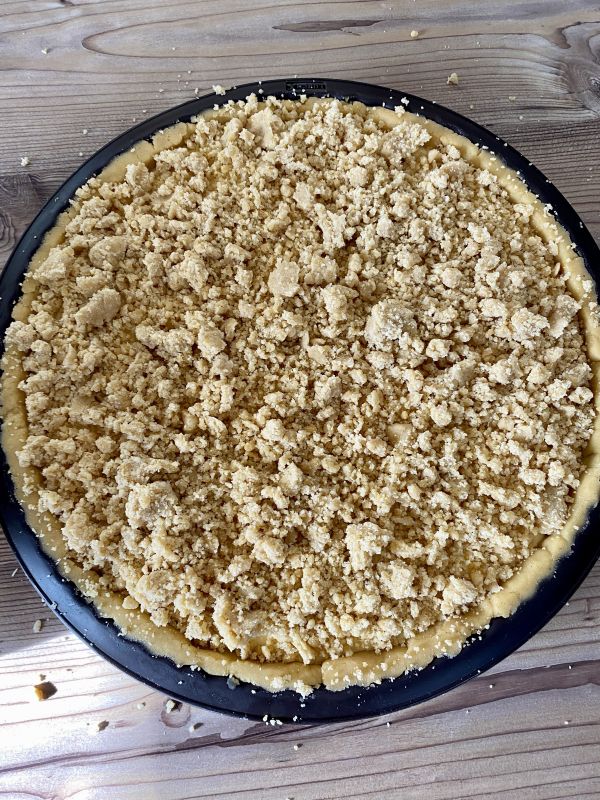 Bei 175 Grad ca. 45 min mit Umluft backen. Wenn die Streusel eine schön hellbraune Farbe haben, mit Alufolie abdecken.