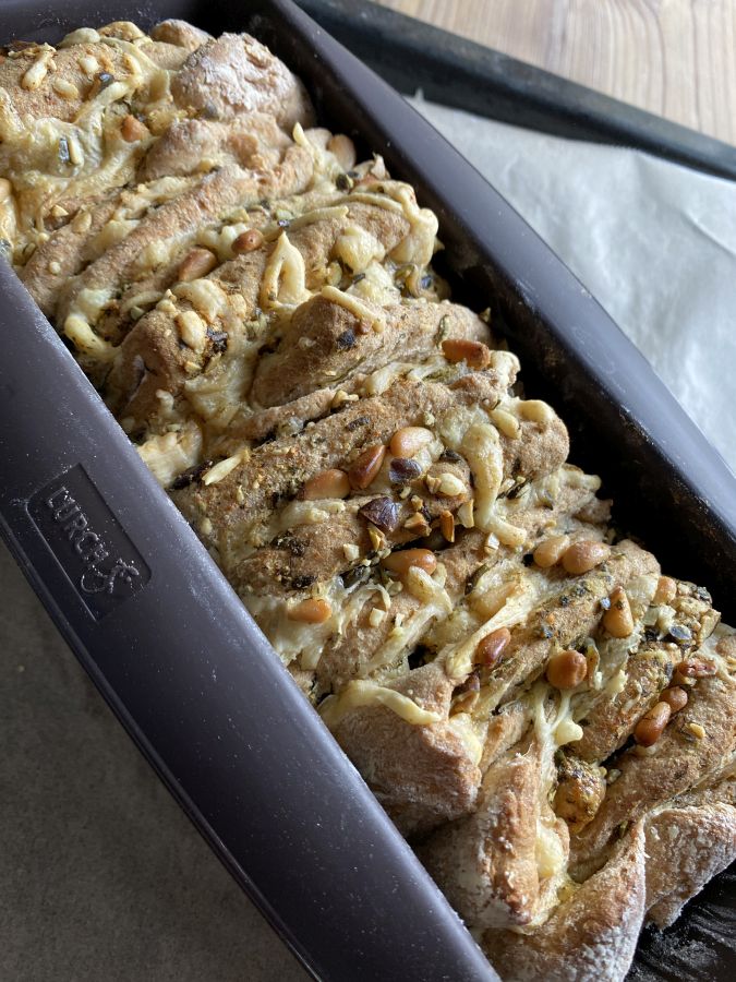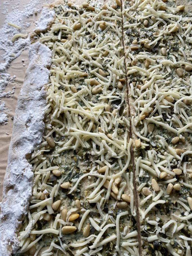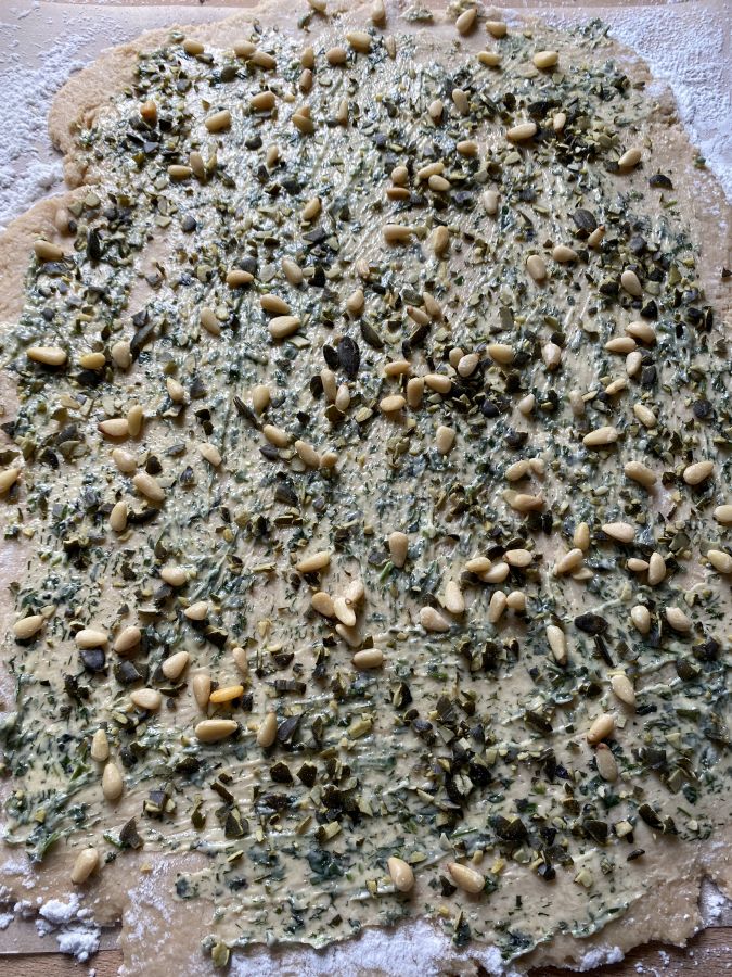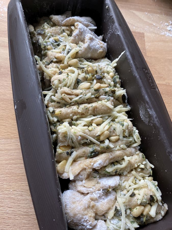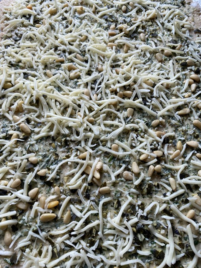 Mit den Pinienkernen und Kürbiskernen bestreuen.