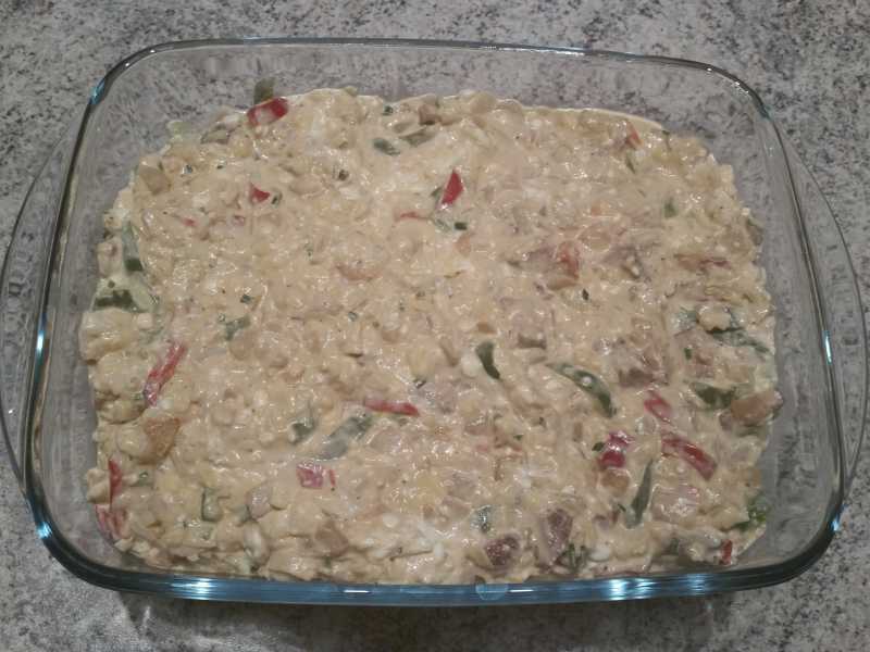 Die beiden Frischkäsesorten mit den beiden geriebenen Käsesorten gut verrühren und mit Schnittlauch, Salz und Pfeffer würzen. Das Rindfleisch in ca. 1 cm dicke Würfel schneiden und zusammen mit dem Gemüse aus der Pfanne unter die Käsemasse rühren. Alles in eine Auflaufform füllen und bei 175 °C für ca. 30 Minuten in den Ofen schieben.