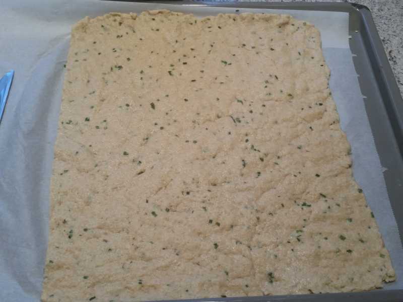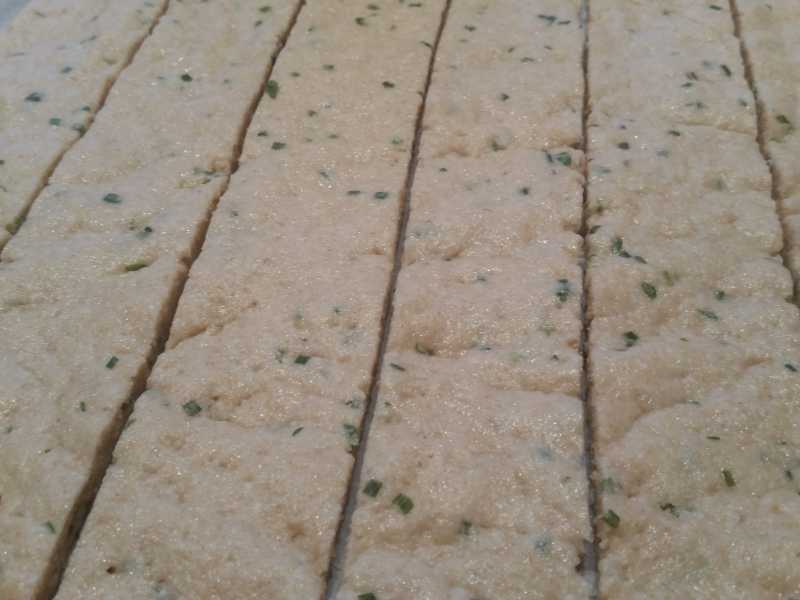 400 ml Wasser und 3 EL Olivenöl in eine Rührschüssel geben. Die Backmischung und das Zwiebelpulver zugeben und alles zu einem gleichmäßigen Teig verrühren. Mit sehr nassen Händen auf einem mit Backpapier ausgelegten Backblech auf eine Dicke von ca. 0.5 cm ausrollen. Das grobe Salz mit dem Mörser etwa zerkleinern und über den Teig streuen. Anschließend den Teig mit der Rückseite eines Buttermessers in ca. 3 cm breite Streifen “schneiden” (s. Photo), das wird anschließend dann eine Art Sollbruchstelle.