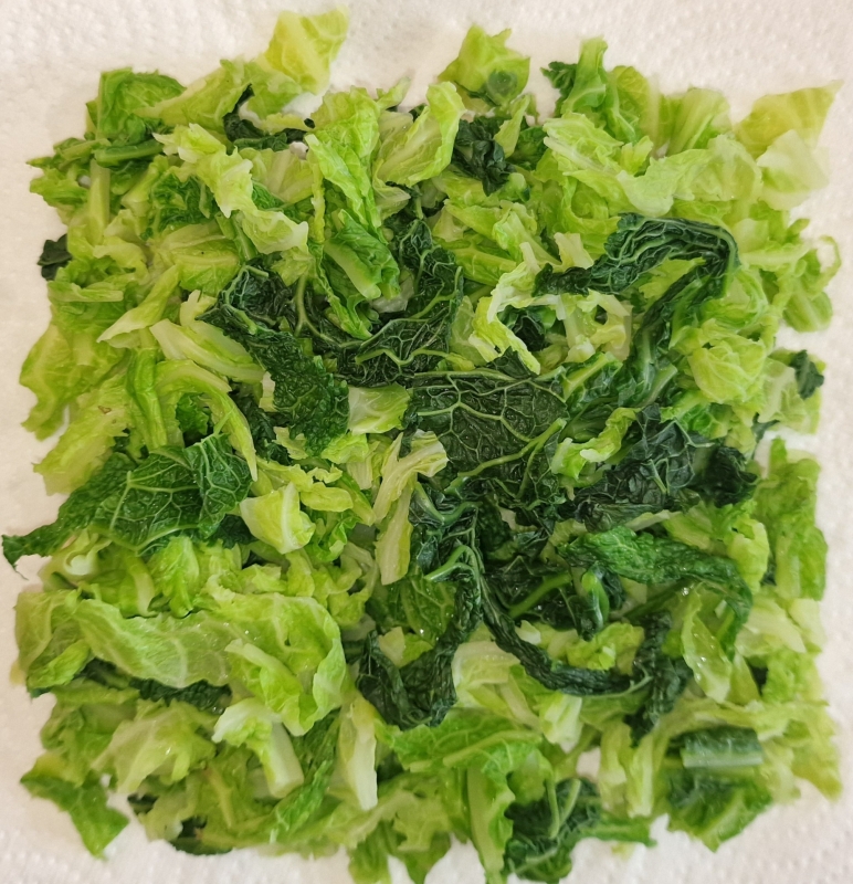 Für die Fülle Wirsing vom Strunk entfernen und in knapp 1 cm breite Streifen schneiden. Ich massier den Kohl etwas, dann wird er weicher. Einen Topf mit Wasser zum Kochen bringen. Wenn es kocht, etwas von der Flamme nehmen und 4 Minuten blanchieren, mit Schaumlöffel aus dem Wasser holen, etwas abtropfen lassen und den Kohl danach in eiskaltes Wasser geben.