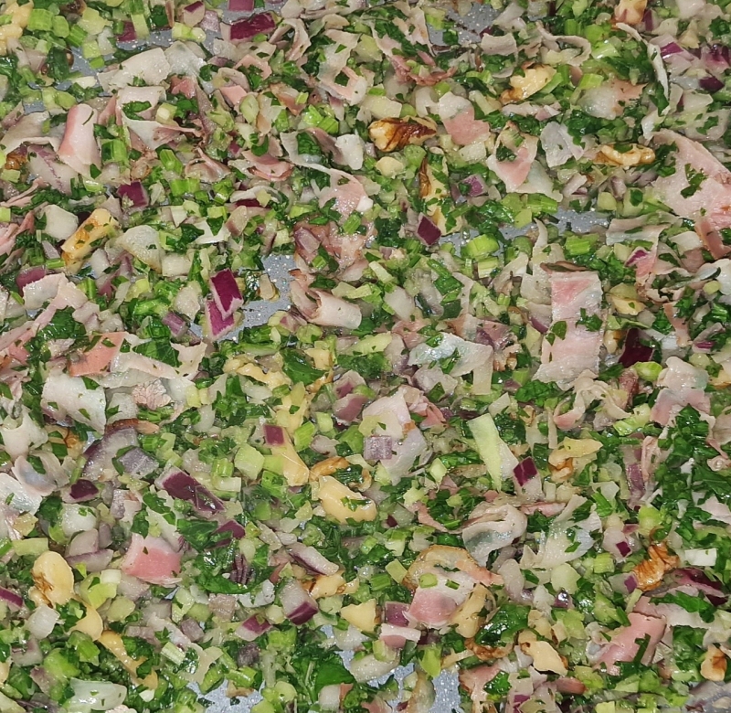 Zwiebel, Petersilie und 1 Handvoll Kohl klein schneiden, den Speck in größere Stücke schneiden und die Walnüsse hacken. In einer Pfanne Butterschmalz schmelzen lassen, Zwiebel etwas anrösten, Speck, Petersilie, den kleingeschnittenen Kohl, die Hälfte der Gewürze und die Walnüsse hinzufügen und mit anbraten. Den blanchierten Kohl ausdrücken und zur Zwiebel Mischung hinzufügen und kurz mit anbraten. Etwas zur Seite stellen zum abkühlen.
