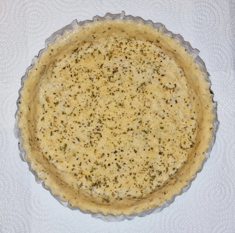 In der Zwischenzeit den Teig zubereiten, Die Walnüsse klein hacken und mit den trockenen Zutaten vermengen. Eier mit Sauerrahm und Wasser versprudeln, die trockenen Zutaten hinzufügen und einen Teig zubereiten. Mit Hilfe von Bambusfaser auf einem rundzugeschnittenem Backpapier ausrollen und die Quicheform auslegen. Funktioniert aber auch gut mit feuchten Fingern. Backofen auf 160 Grad Umluft vorheizen, und für 10 Minuten vorbacken.