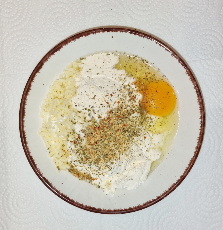 Nun die Fülle fertig stellen. Eier, Sauerrahm, Ricotta und die Hälfte der Gewürze verquirlen, bis auf einen Esslöffel den Bergkäse hinzufügen (Rest zur Seite legen) und gut durchrühren. Von der Kohlmischung 4 - 5 EL zur Seite legen und den Rest mit der Ricotta Eimischung vermengen. Abschmecken ob gewürzt so passt. In die vorgebackene Teigmulde füllen und glattstreichen.