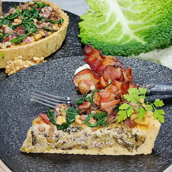 Im vorgeheizten Backofen für 30 Minuten bei 150 Grad Umluft fertig backen. Backofentemperatur bitte an den eigenen Backofen anpassen. Dann mit dem restlichem Bergkäse bestreuen, den zur Seite gelegte Kohlmischung draufstreuen und für 10 Minuten bei 140 Grad Umluft fertigbacken. Backofentüre öffnen und für 20 Minuten im Ofen abkühlen lassen.